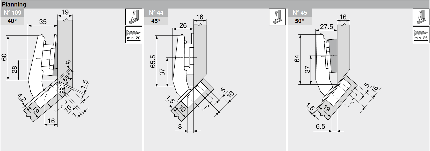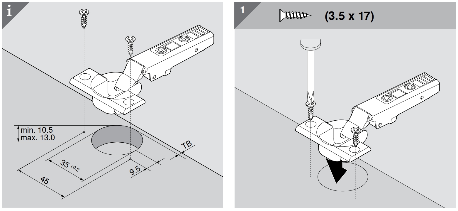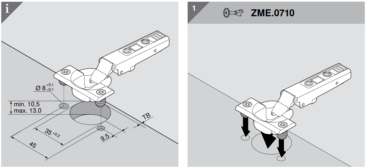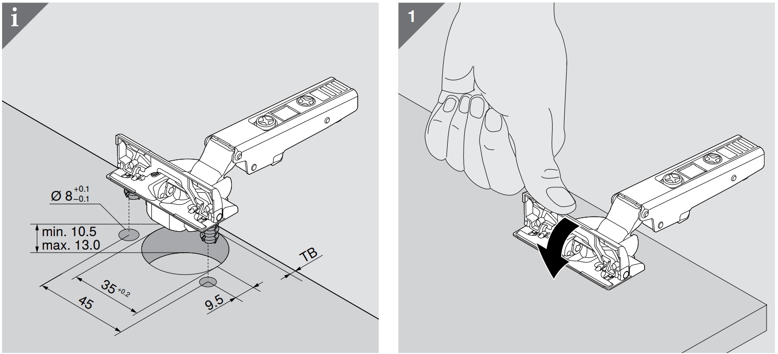 - 特別角鉸鏈開關活動有兩種:緩衝(BLUMOTION)與無彈簧款式(TIP-ON)鉸鏈可與 TIP-ON 撳彈配合使用。
