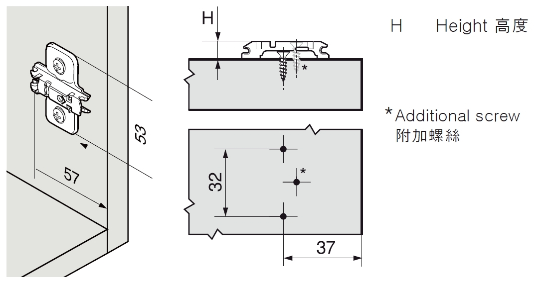 - 無限可變的3D調整:最大高度 ± 3 毫米、側面 ± 2 毫米、深度透過螺旋螺釘調整 +2 毫米。