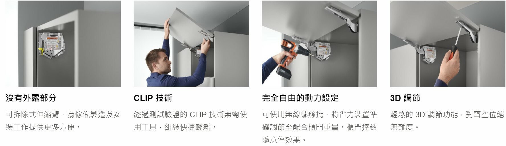 AVENTOS HK-S 輕型上掀門可讓你盡情利用可用的儲存空間,例如雪櫃或食物櫃頂。小巧的省力裝置能夠輕鬆裝入小型的櫃體內,易用度和用家方便程度俱佳。