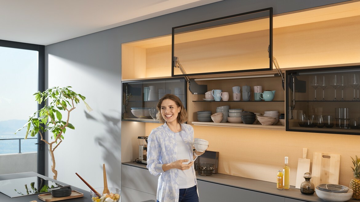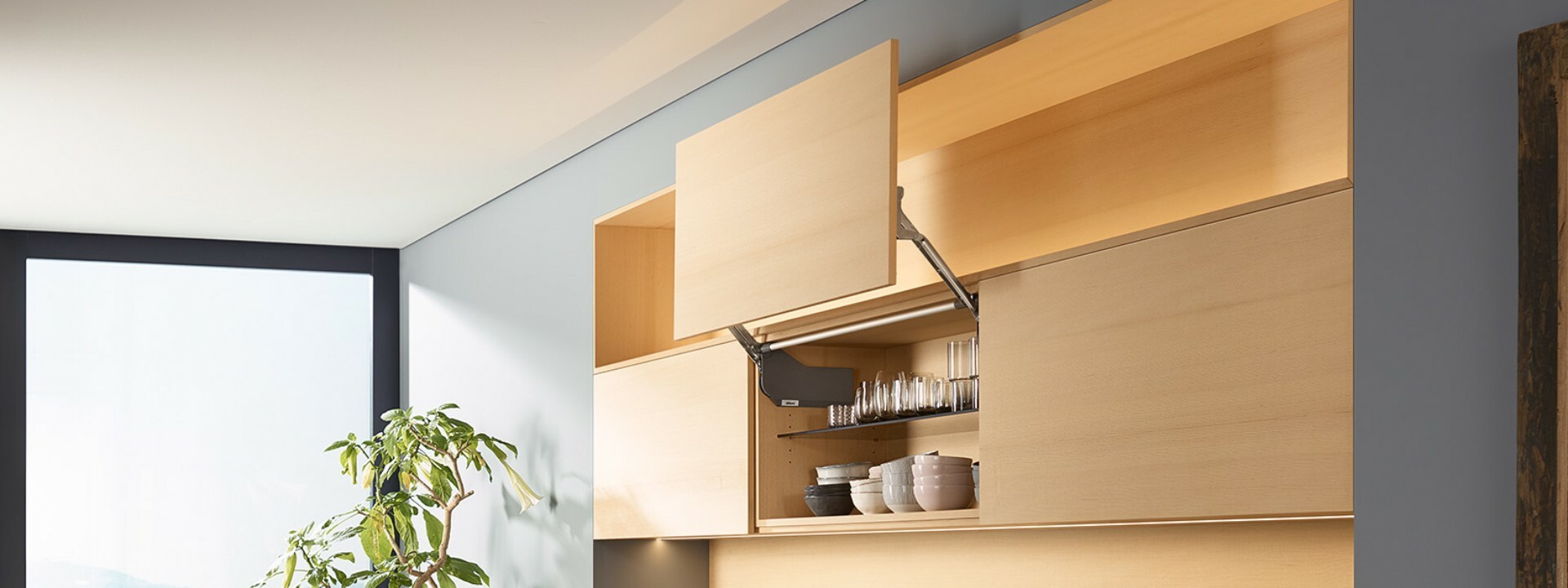 AVENTOS HL 垂直上升五金,讓小型櫃門向上揭起,與櫃體保持平行,是中身及高身吊櫃頂部加設櫃體時的理想方案。櫃門能夠向上及向外揭起,讓你在煮食時也能讓櫃門保持開啟。