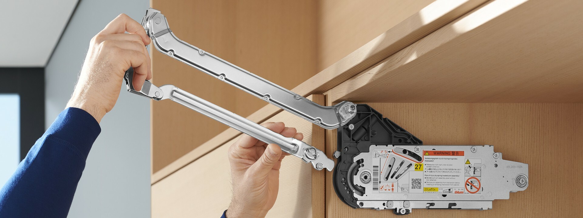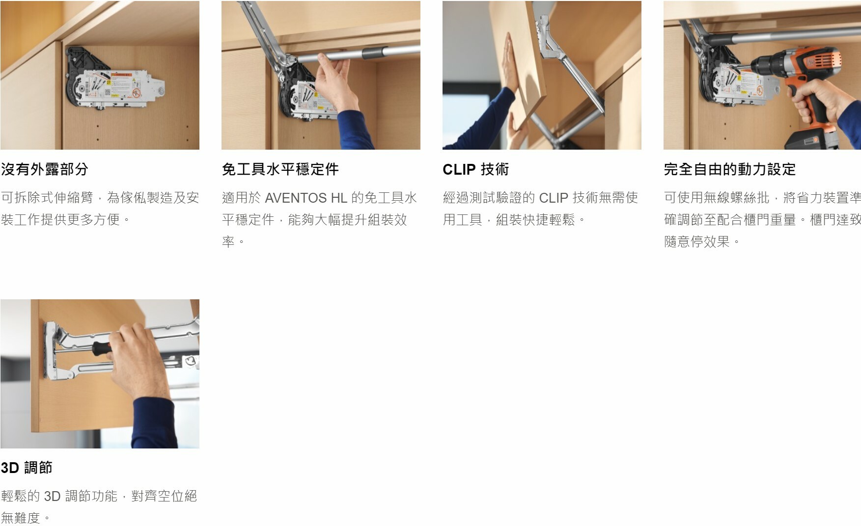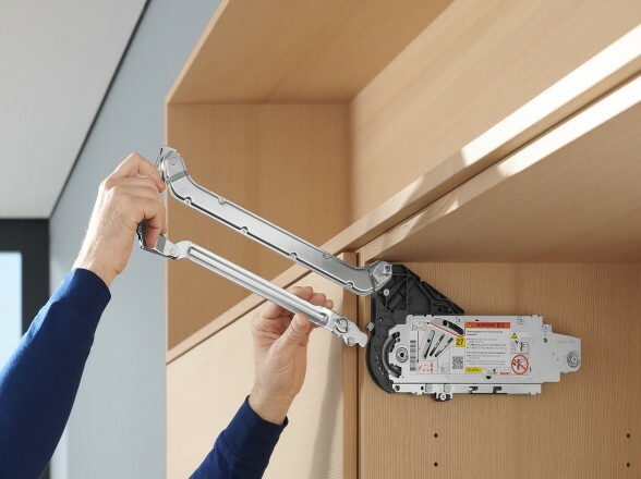 AVENTOS HL 佔用空間極少,讓你能夠快速簡易地組裝及調節。將省力裝置準確調節至配合櫃門重量後,上翻門即可輕鬆開關及固定位置,安全可靠。外露部分可以拆出,方便搬運。