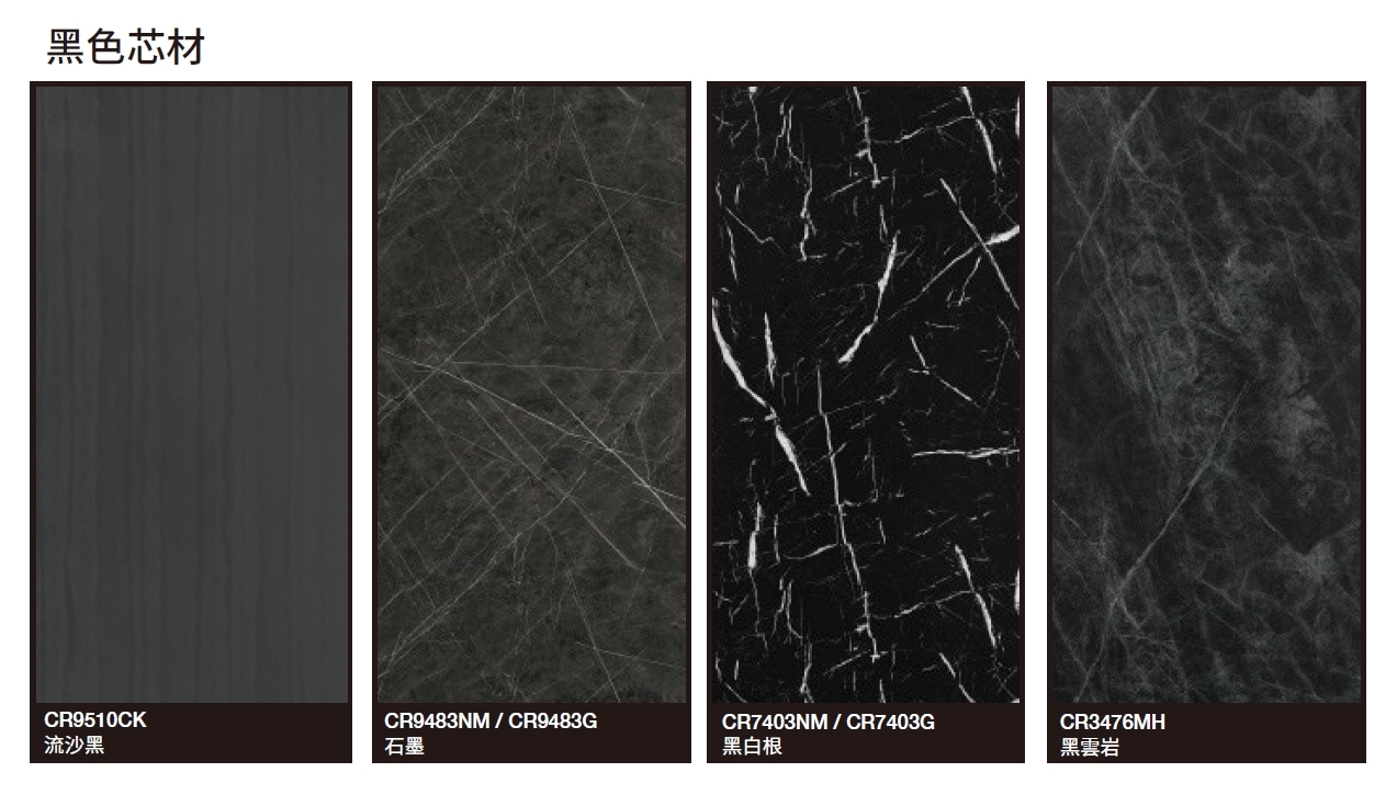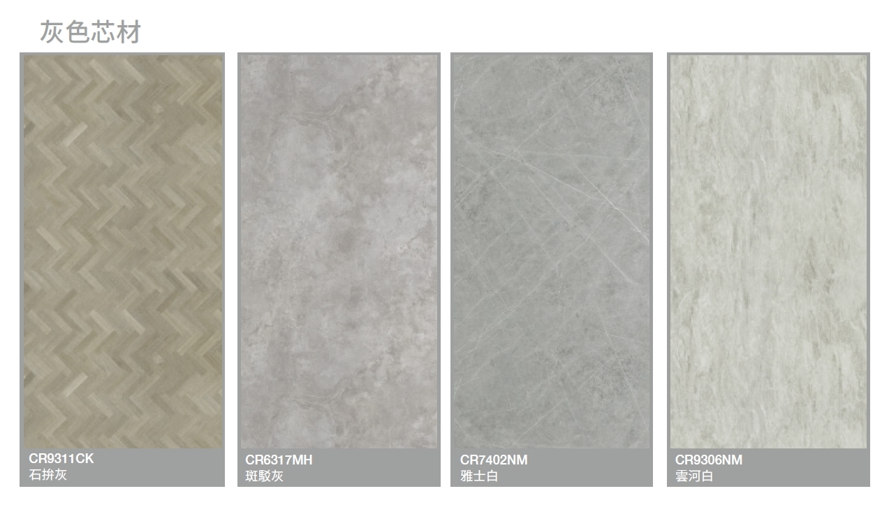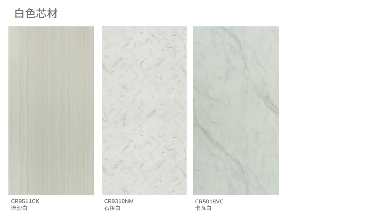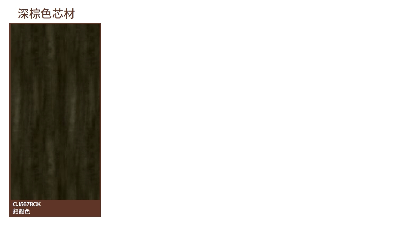 由白色、淺灰色、米黃色、黃棕色、深棕色以至黑色的配色系列,多種芯材色彩選擇,色彩變化,可引發無限想像,適用於各式水平及垂直表面。