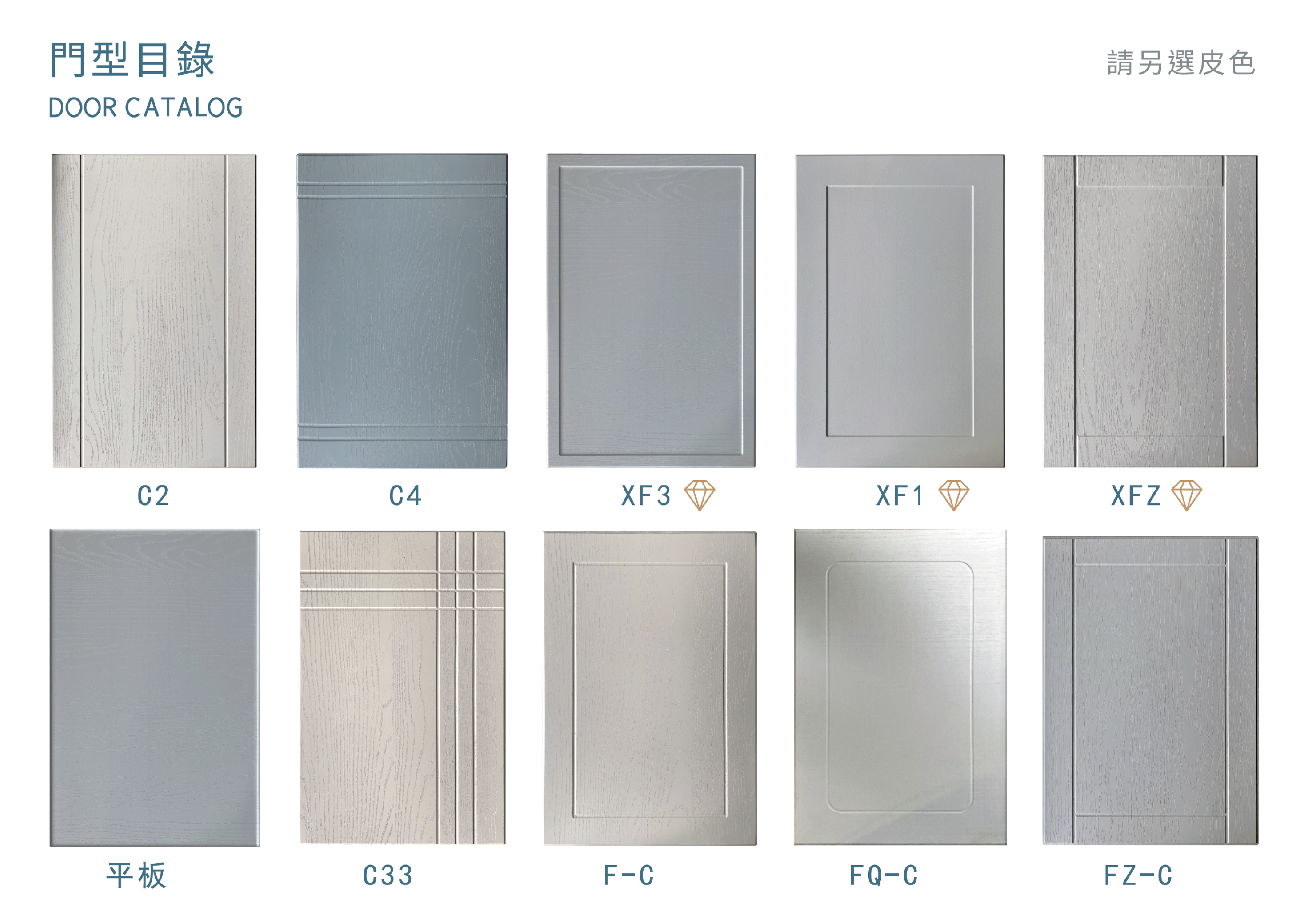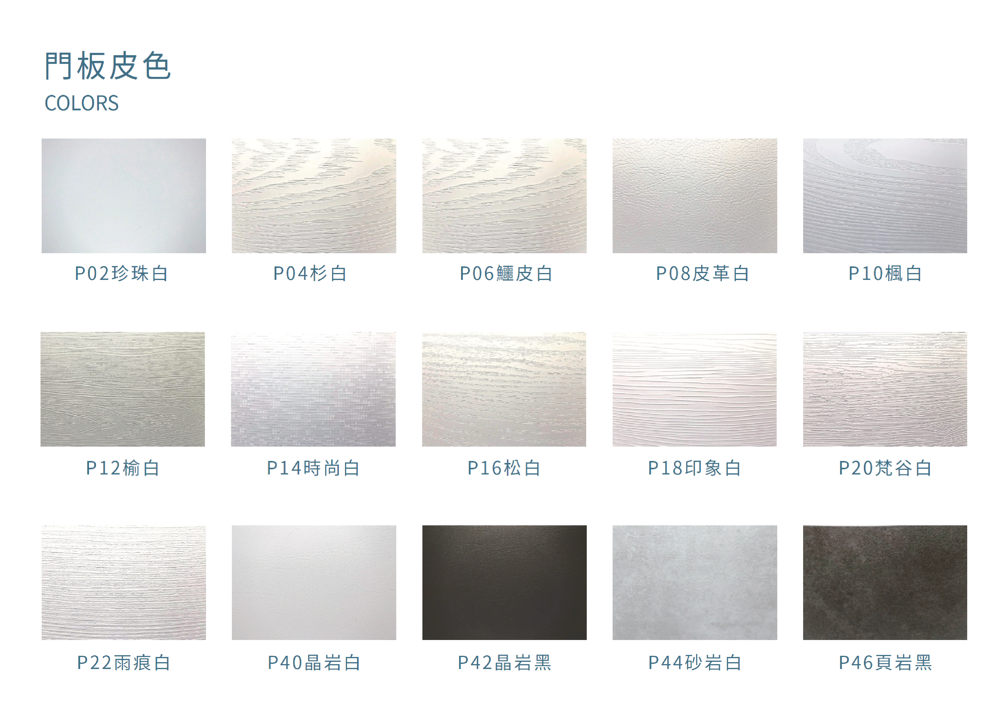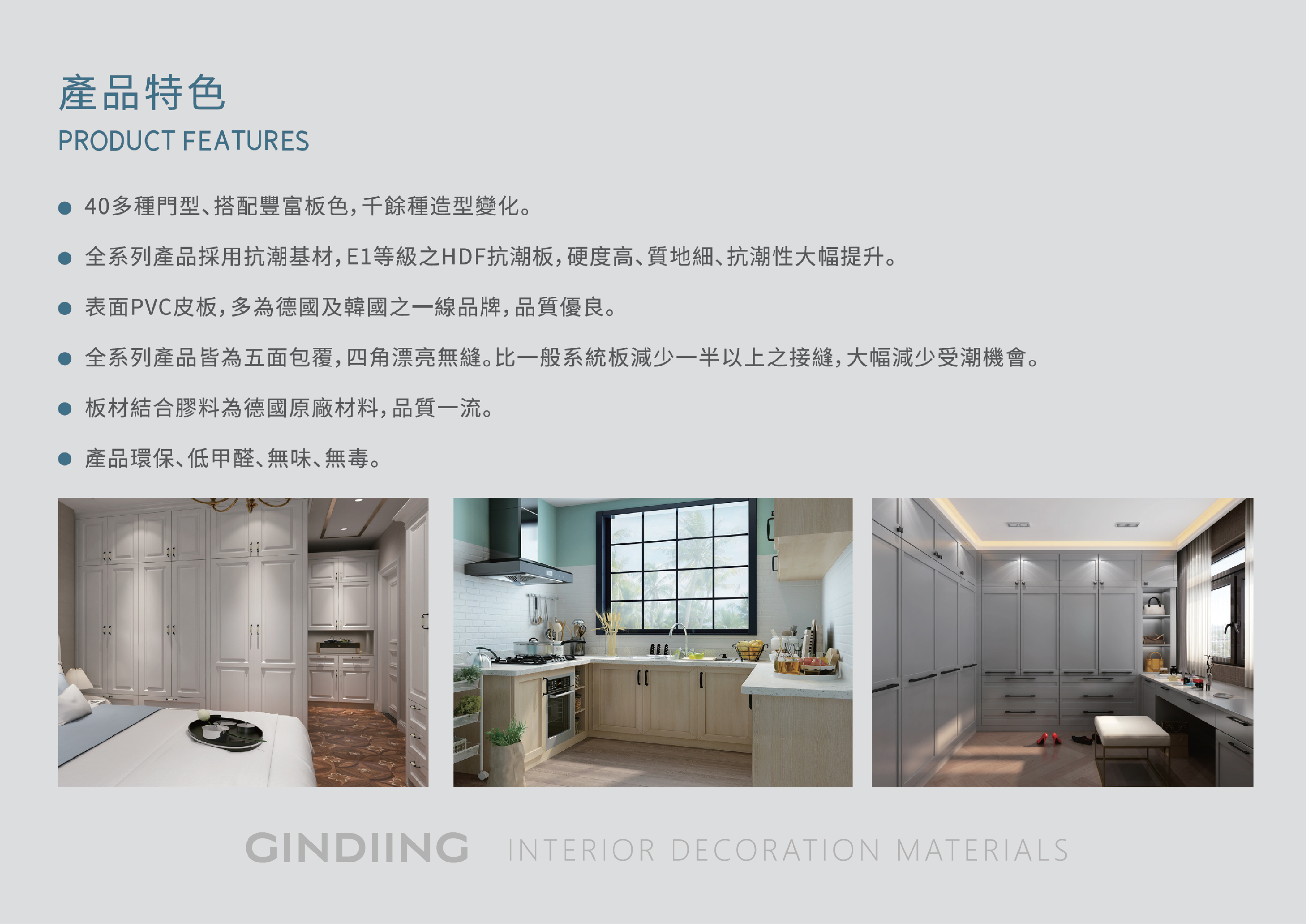 近40種門型、豐富的板色,千餘種造型變化。全系列產品之基材,皆使用E1等級之HDF抗潮芯板,添加防潮成分。硬度高、質地細、抗潮性大幅提升。表面PVC皮板,多為德國及韓國之一線品牌,品質優良。