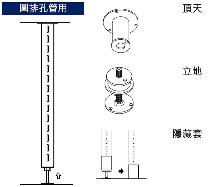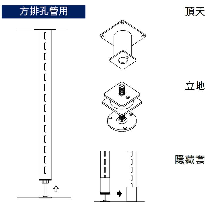 針對排孔管系列的各種管規所設計的專用調整腳(立地) / 調整腳輔助座(頂天)。三者結合成一立柱。