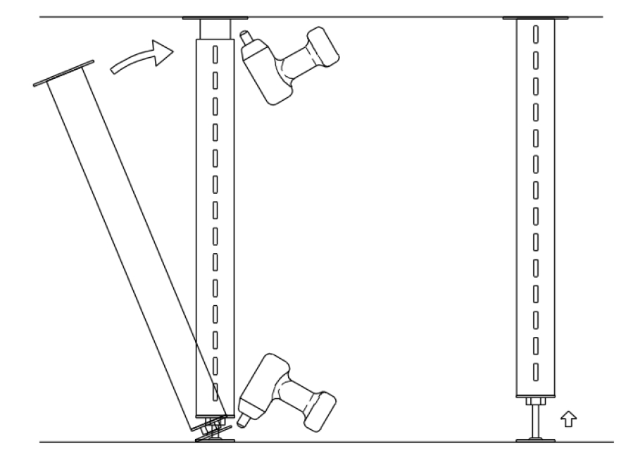 排孔管上方套入輔助座鎖上天花板,排孔管下方安裝調整腳固定於地板。最後再將調整腳的螺絲向上拴緊即可。
