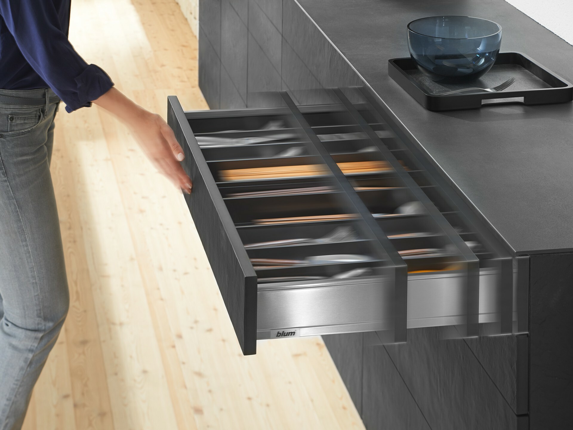 高度177mm的高抽和其內抽,可選擇喜歡的插板,這是「可自由搭配材質的插板(LEGRABOX free)」讓你可訂製獨一無二的設計。比如:玻璃、木皮板、壓克力甚至石材的插板,為你製造出獨特的突出效果。