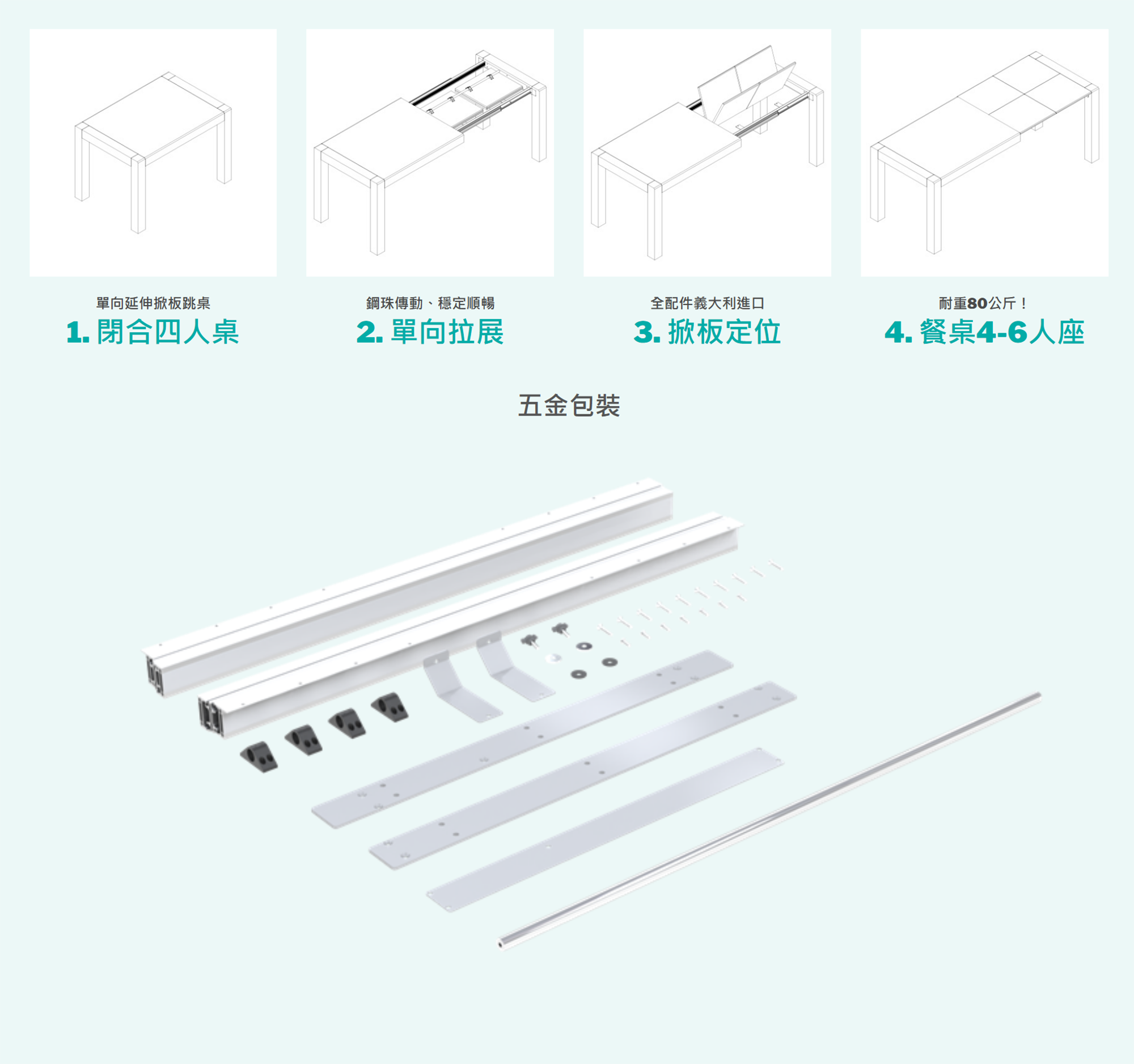 RAM INDUSTRIE 義大利研發、製造,耐重鋁合金餐桌滑軌,鋼珠傳動系統搭配PVC珠座,靜音耐用!義大利特殊陽極處理,表面光滑耐磨,全展開80kgs載重實木桌也輕鬆無負擔。