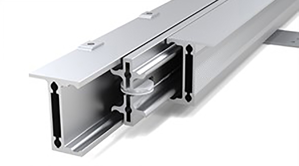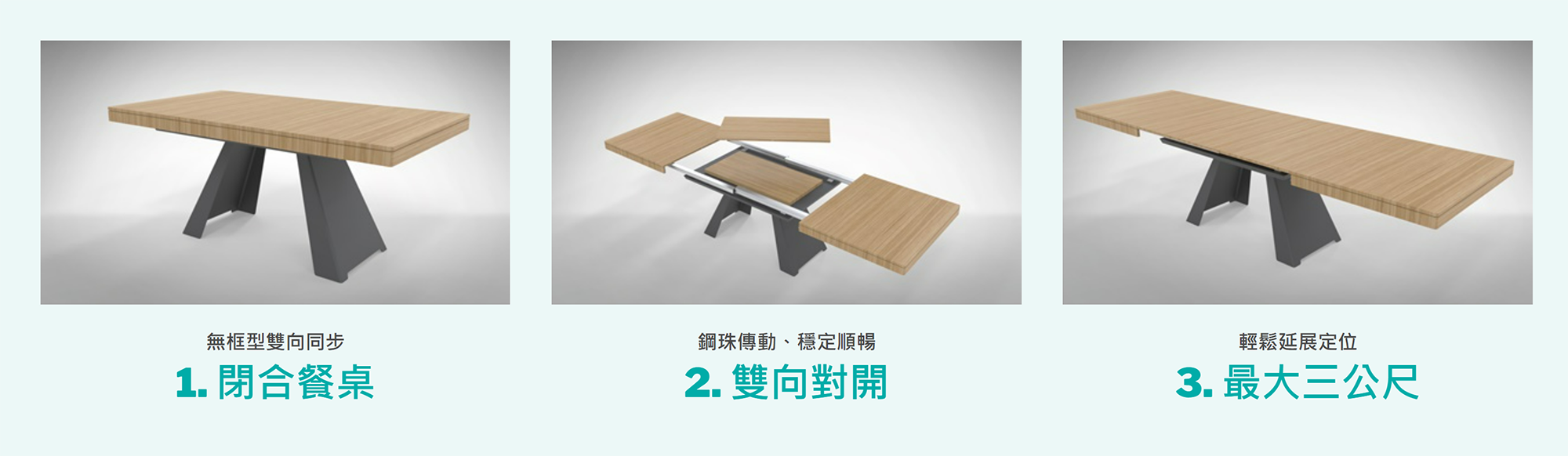 無框型中央對開鋁合金鋼珠滑軌五金,安裝簡易、桌體設計自由度高,高張力傳動繩索同步性佳,可配合各式伸縮桌設計需求。