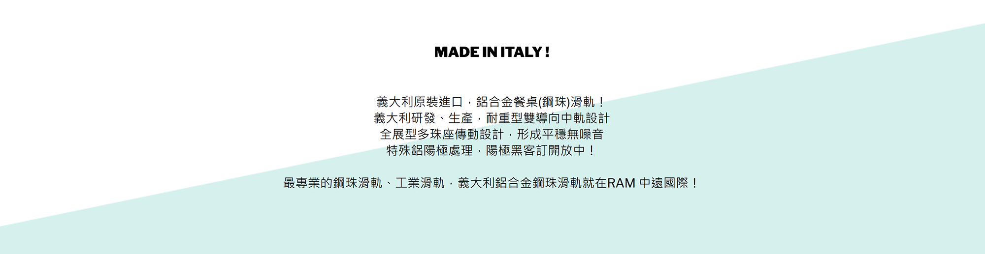 RAM INDUSTRIE 義大利研發、製造,耐重鋁合金餐桌滑軌,鋼珠傳動系統搭配PVC珠座,靜音耐用!義大利特殊陽極處理,表面光滑耐磨,全展開80kgs載重實木桌也輕鬆無負擔。