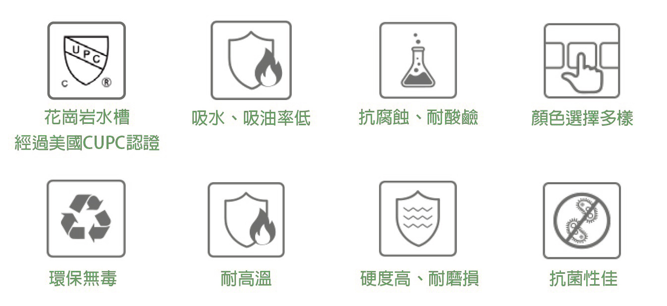 能夠抵抗日常生活中的磨損、凹陷、切割、破裂、 染色以及抗菌等等,是廚房水槽的最佳材質。
