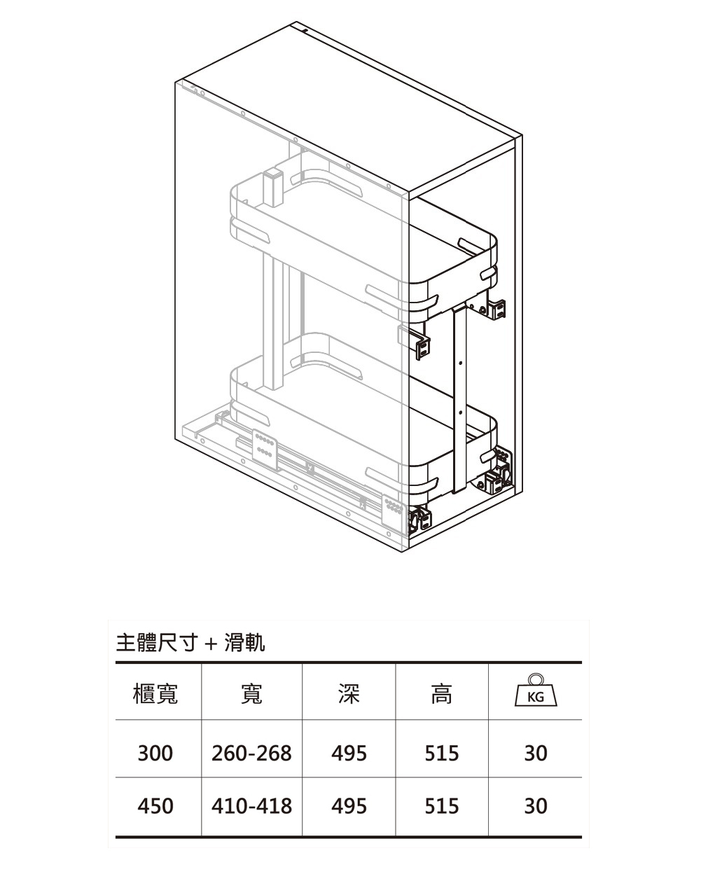 ● 主體尺寸+滑軌:寬260~268 x 深495 x 高515 (mm)
